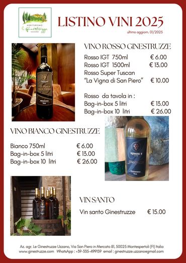 We have 5 hectares. of vineyards with the grape varieties: Sangiovese, Trebbiano, Malvasia, Canaiolo, Colorino and Merlot. We produce white wine, red wine (DOCG and IGT) under the brand "ginestruzze" , the famous Tuscan Vin Santo and our Super Tuscan wine, “La Vigna di San Piero”, the most prestigious red wine in our range. Hereunder, our price list 2025.